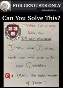 Imagine there are seven men, and each man has seven wives. At first, this may sound complicated, but let’s simplify it. If each of the seven men has seven wives, then to find the total number of wives, we multiply: 7 men × 7 wives = 49 wives.