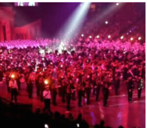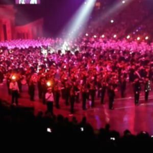 The scene starts with a single singer standing among a crowd of more than 200 bagpipers. The moments of silence slowly turn into his solo rendition of a gentle, baritone Amazing Grace. His voice is captivating as each verse is sung into the echoing arena. Many people commented they were moved to tears and had chills by his ending note.