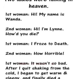 When Two Women meet in Heaven – LOL 2nd woman: I died of a massive heart attack. I suspected that my husband was cheating, so I came…